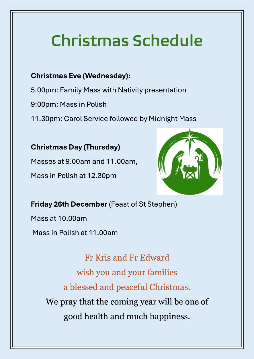 Sunday - 7.15am (in Polish); 9.00am; 11.00am; 12.30pm (in Polish)
